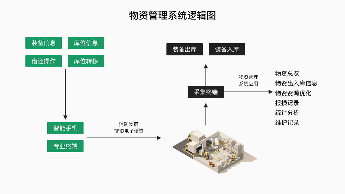 通过REID、电子标签等技术,实现对消防物资、 车辆的精细化动态管理、出入库管理。 合理采购,维护资源、优化资源,做到底数清楚,情况明。